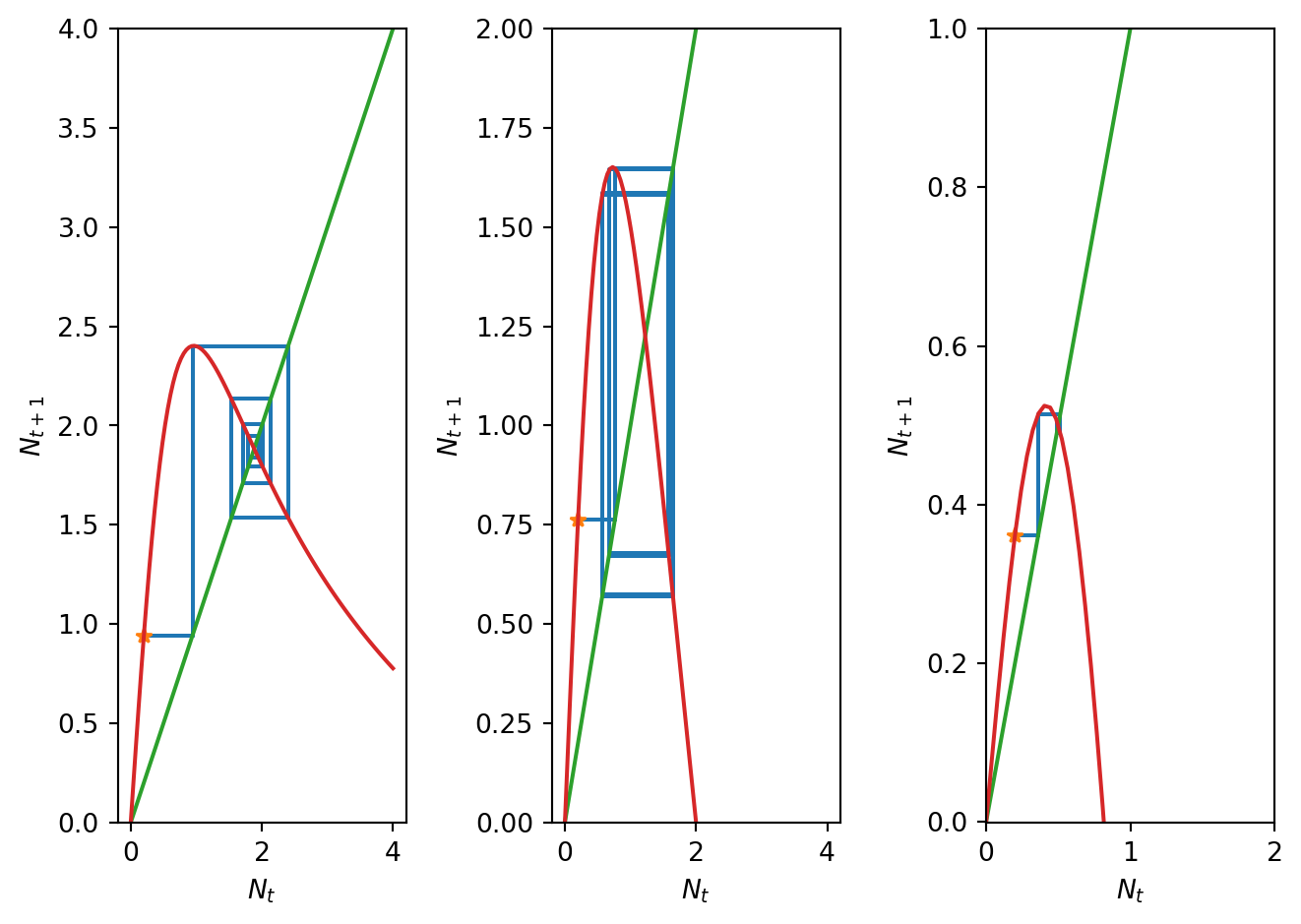 import numpy as npimport matplotlib.pyplot as plt# Define timeT=10t = np.arange(0, T, 1)# Define parametersN_0=0.2h_1=0.1h_2=1.0h_3=3.0r=5.0N_max=4.0# Compute solution at differnet values of hN1,CobwebSol1=SolveSingleDiffAndCobweb(t,densmodelwithharvesting,N_0,[r,h_1])N2,CobwebSol2=SolveSingleDiffAndCobweb(t,densmodelwithharvesting,N_0,[r,h_2])N3,CobwebSol3=SolveSingleDiffAndCobweb(t,densmodelwithharvesting,N_0,[r,h_3])# Evulate the function H at different values of HN_plot=np.linspace(0,N_max,100)H_N_plot1=densmodelwithharvesting(N_plot,[r,h_1])H_N_plot2=densmodelwithharvesting(N_plot,[r,h_2])H_N_plot3=densmodelwithharvesting(N_plot,[r,h_3])# Plot resultsfig, ax = plt.subplots(1,3)ax[0].plot(CobwebSol1[:,0], CobwebSol1[:,1])ax[0].plot(CobwebSol1[0,0], CobwebSol1[0,1],'*')ax[0].plot([0, N_max], [0, N_max])ax[0].plot(N_plot, H_N_plot1)ax[0].set_ylim([-0.001, 4])ax[0].set_xlabel('$N_t$')ax[0].set_ylabel('$N_{t+1}$')ax[1].plot(CobwebSol2[:,0], CobwebSol2[:,1])ax[1].plot(CobwebSol2[0,0], CobwebSol2[0,1],'*')ax[1].plot([0, N_max], [0, N_max])ax[1].plot(N_plot, H_N_plot2)ax[1].set_ylim([-0.001, 2])ax[1].set_xlabel('$N_t$')ax[1].set_ylabel('$N_{t+1}$')ax[2].plot(CobwebSol3[:,0], CobwebSol3[:,1])ax[2].plot(CobwebSol3[0,0], CobwebSol3[0,1],'*')ax[2].plot([0, N_max], [0, N_max])ax[2].plot(N_plot, H_N_plot3)ax[2].set_ylim([-0.001, 1])ax[2].set_xlim([-0.001, 2])ax[2].set_xlabel('$N_t$')ax[2].set_ylabel('$N_{t+1}$')plt.tight_layout()plt.show()