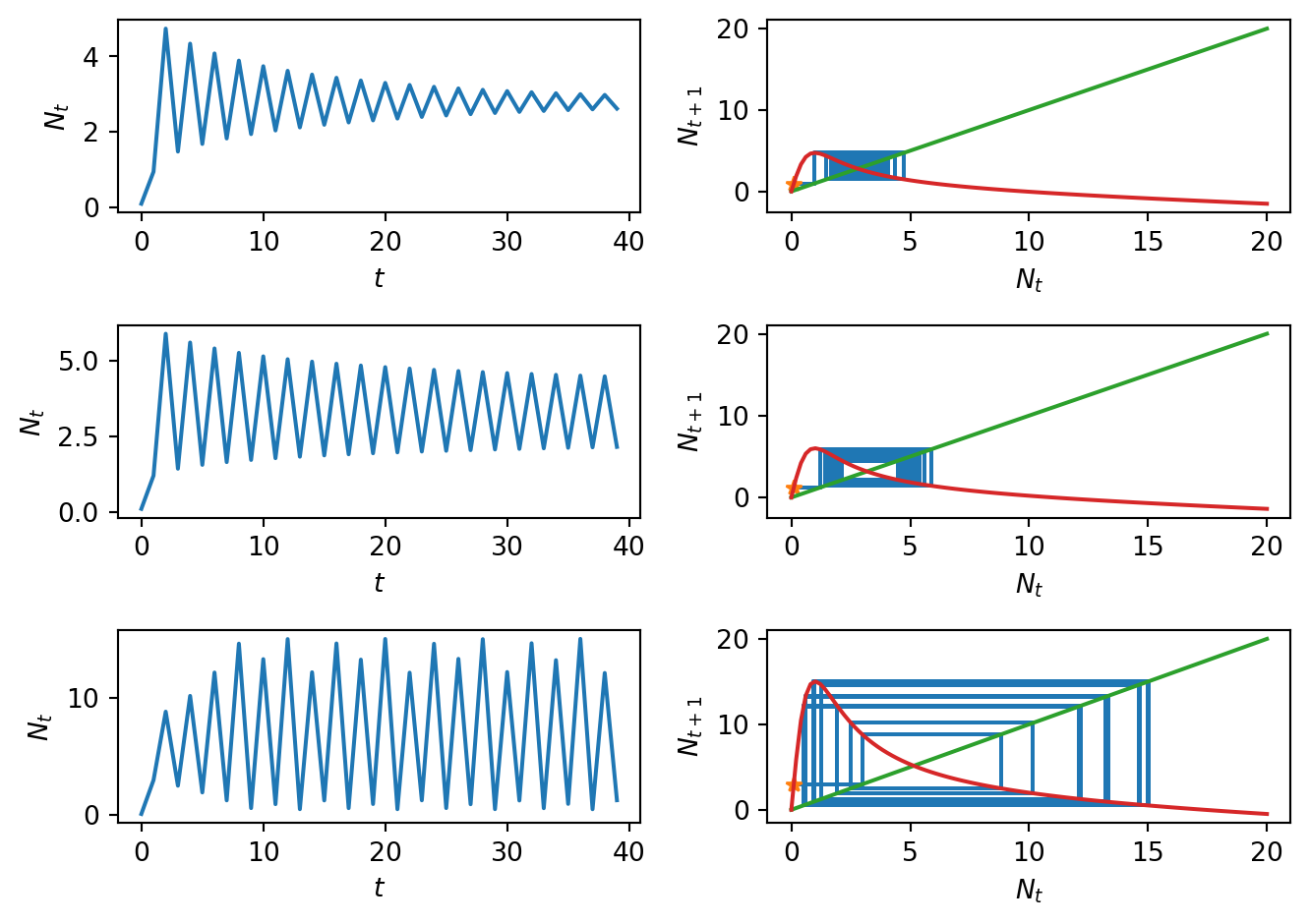 import numpy as npimport matplotlib.pyplot as plt# Define timeT=40t = np.arange(0, T, 1)# Define model parametersN_0=0.1r_1=9.68r_2=12.221r_3=30.25h=0.1# Plotting parametersN_max=20.0# Solve model and compuote cobweb dataN1,CobwebSol1=SolveSingleDiffAndCobweb(t,densmodelwithharvesting,N_0,[r_1,h])N2,CobwebSol2=SolveSingleDiffAndCobweb(t,densmodelwithharvesting,N_0,[r_2,h])N3,CobwebSol3=SolveSingleDiffAndCobweb(t,densmodelwithharvesting,N_0,[r_3,h])# Discretise N and generate H for different values of rN_plot=np.linspace(0,N_max,100)H_N_plot1=densmodelwithharvesting(N_plot,[r_1,h])H_N_plot2=densmodelwithharvesting(N_plot,[r_2,h])H_N_plot3=densmodelwithharvesting(N_plot,[r_3,h])# Make figurefig, ax = plt.subplots(3,2)ax[0,0].plot(t, N1)ax[0,0].set_xlabel('$t$')ax[0,0].set_ylabel('$N_{t}$')ax[0,1].plot(CobwebSol1[:,0], CobwebSol1[:,1])ax[0,1].plot(CobwebSol1[0,0], CobwebSol1[0,1],'*')ax[0,1].plot([0, N_max], [0, N_max])ax[0,1].plot(N_plot, H_N_plot1)ax[0,1].set_xlabel('$N_t$')ax[0,1].set_ylabel('$N_{t+1}$')ax[1,0].plot(t, N2)ax[1,0].set_xlabel('$t$')ax[1,0].set_ylabel('$N_{t}$')ax[1,1].plot(CobwebSol2[:,0], CobwebSol2[:,1])ax[1,1].plot(CobwebSol2[0,0], CobwebSol2[0,1],'*')ax[1,1].plot([0, N_max], [0, N_max])ax[1,1].plot(N_plot, H_N_plot2)ax[1,1].set_xlabel('$N_t$')ax[1,1].set_ylabel('$N_{t+1}$')ax[2,0].plot(t, N3)ax[2,0].set_xlabel('$t$')ax[2,0].set_ylabel('$N_{t}$')ax[2,1].plot(CobwebSol3[:,0], CobwebSol3[:,1])ax[2,1].plot(CobwebSol3[0,0], CobwebSol3[0,1],'*')ax[2,1].plot([0, N_max], [0, N_max])ax[2,1].plot(N_plot, H_N_plot3)ax[2,1].set_xlabel('$N_t$')ax[2,1].set_ylabel('$N_{t+1}$')plt.tight_layout()plt.show()