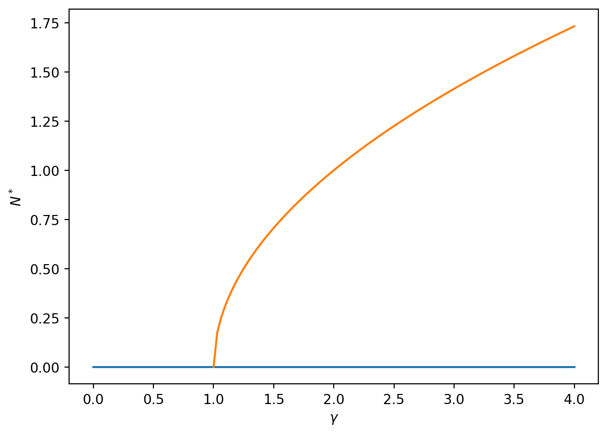 Hence if \(\gamma>1+h\), \(N^*=0\) is unstable. Note that this is the condition that determines whether the non-zero fixed point exists or not.
