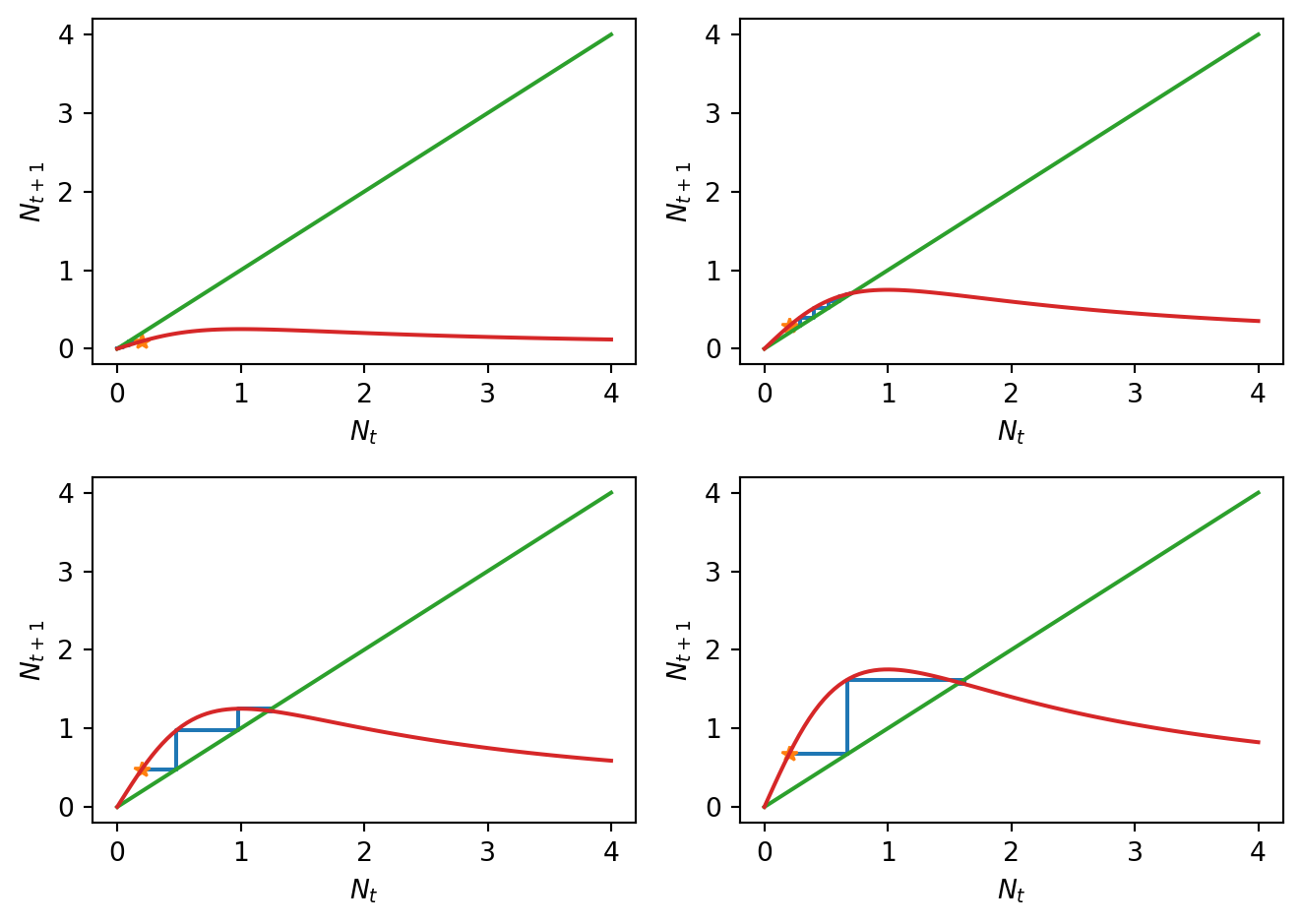In Figure 2.3 you can explore simulations of the Ricker model.