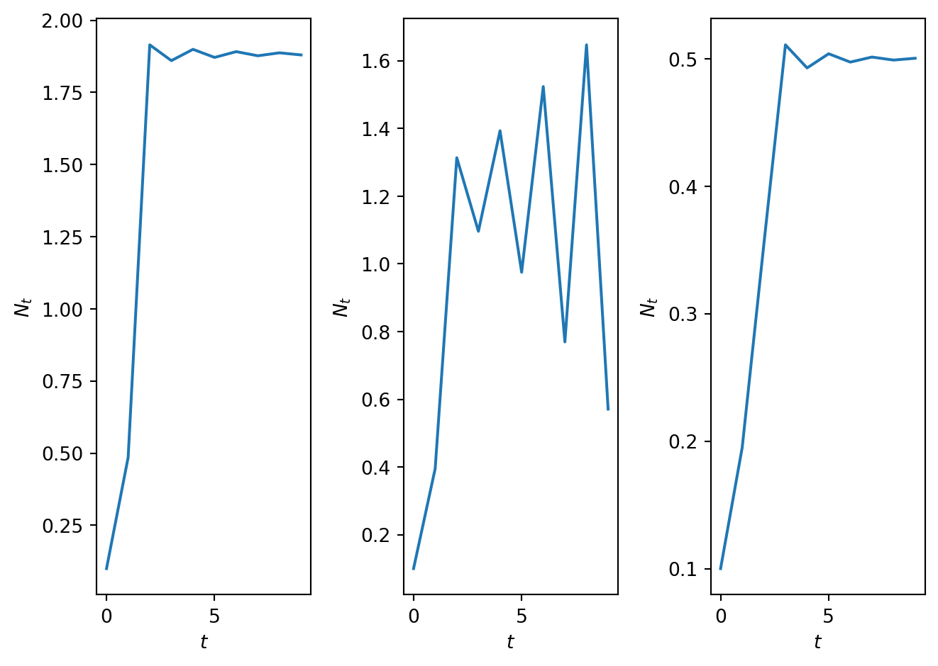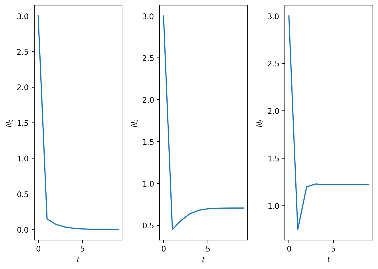 import numpy as npimport matplotlib.pyplot as plt# Define time vectorT=10t = np.arange(0, T, 1)# DEfine model parametersN_0=0.1gam=5.0h_1=0.1h_2=1.0h_3=3.0# Define rhs of differnece equationdef densmodelwithharvesting(x,par): r=par[0] h=par[1] f=r*x/(1+x**2)-h*xreturn f# Compute solution for different values of parametersN_1=SolveSingleDiff(t,densmodelwithharvesting,N_0,[gam,h_1])N_2=SolveSingleDiff(t,densmodelwithharvesting,N_0,[gam,h_2])N_3=SolveSingleDiff(t,densmodelwithharvesting,N_0,[gam,h_3])# Plot resultsfig, ax = plt.subplots(1,3)ax[0].plot(t, N_1)ax[0].set_xlabel('$t$')ax[0].set_ylabel('$N_t$')ax[1].plot(t, N_2)ax[1].set_xlabel('$t$')ax[1].set_ylabel('$N_t$')ax[2].plot(t, N_3)ax[2].set_xlabel('$t$')ax[2].set_ylabel('$N_t$')plt.tight_layout()plt.show()