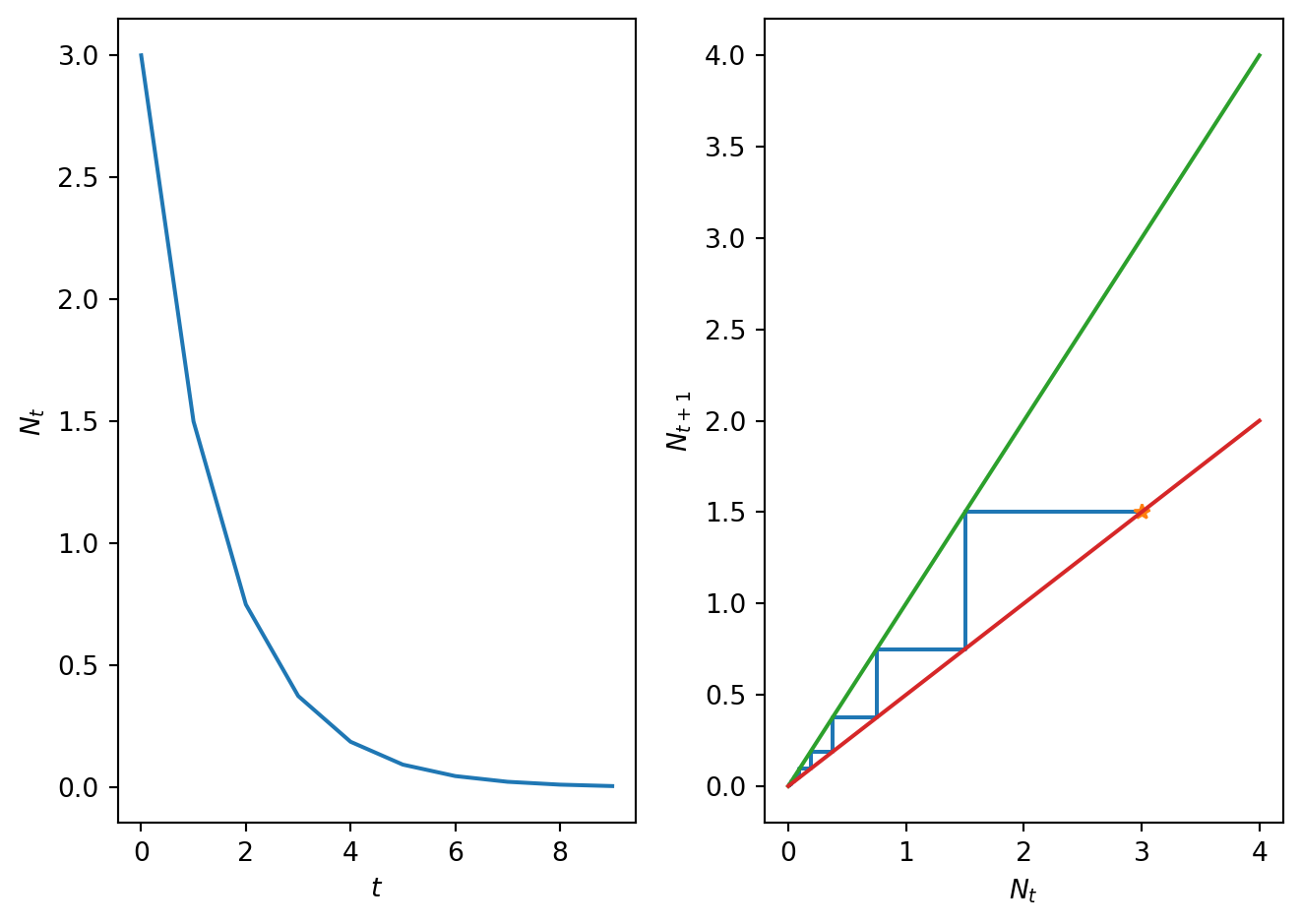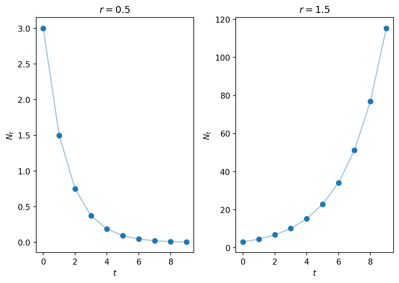 import numpy as npimport matplotlib.pyplot as plt# Define time vectorT=10t = np.arange(0, T, 1)# Initialze solution vectorN = np.zeros_like(t,dtype=float)N_2 = np.zeros_like(t,dtype=float)# Define model parameters and initial conditionN_0=3.0r_1=0.5r_2=1.5# function to compute the rhs of the difference equationdef rhs(x,par): r=par f=r*xreturn f# function to iteratively compute the solution to the difference equationdef SolveSingleDiff(t,rhs,N_0,par): N = np.zeros_like(t,dtype=float) N[0]=N_0for i in t:if i>0: N[i]=rhs(N[i-1],par) return N# Solve the difference equationN=SolveSingleDiff(t,rhs,N_0,r_1)# Solve the difference equation with different value of parmeter rN_2=SolveSingleDiff(t,rhs,N_0,r_2)# Plot resultsfig, ax = plt.subplots(1,2)ax[0].plot(t, N, linestyle='-', alpha=0.4) # faint lineax[0].plot(t, N, linestyle='None', marker='o',color='C0') # solid markersax[0].set_xlabel('$t$')ax[0].set_ylabel('$N_{t}$')ax[0].set_title('$r = 0.5$')ax[1].plot(t, N_2, linestyle='-', alpha=0.4) # faint lineax[1].plot(t, N_2, linestyle='None', marker='o',color='C0') # solid ax[1].set_xlabel('$t$')ax[1].set_ylabel('$N_{t}$')ax[1].set_title('$r = 1.5$')plt.tight_layout()plt.show()