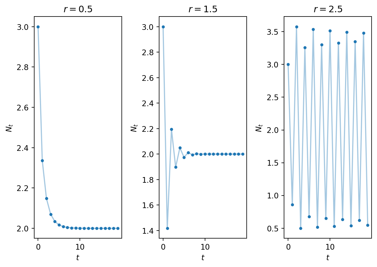 import numpy as npimport matplotlib.pyplot as plt# Define parametersr_1=0.5r_2=1.5r_3=2.5K=2.0# Define time vectorT=20t = np.arange(0, T, 1)# Define initial conditions for each simulation runN_1 = np.zeros_like(t,dtype=float)N_2 = np.zeros_like(t,dtype=float)N_3 = np.zeros_like(t,dtype=float)# Define rhs of Ricker modeldef rickerrhs(x,par): r=par[0] K=par[1] f=x*np.exp(r*(1-x/K))return f# Use the function defined above tom compute time series solution for Ricker modelN_1=SolveSingleDiff(t,rickerrhs,N_0,[r_1,K])N_2=SolveSingleDiff(t,rickerrhs,N_0,[r_2,K])N_3=SolveSingleDiff(t,rickerrhs,N_0,[r_3,K])# Plot solutionsfig, ax = plt.subplots(1,3)ax[0].plot(t, N_1, linestyle='-', alpha=0.4) # faint lineax[0].plot(t, N_1, linestyle='None', marker='o',color='C0', ms=3) # solid ax[0].set_xlabel('$t$')ax[0].set_ylabel('$N_{t}$')ax[0].set_title('$r = 0.5$')ax[1].plot(t, N_2, linestyle='-', alpha=0.4) # faint lineax[1].plot(t, N_2, linestyle='None', marker='o',color='C0', ms=3) # solid ax[1].set_xlabel('$t$')ax[1].set_ylabel('$N_{t}$')ax[1].set_title('$r = 1.5$')ax[2].plot(t, N_3, linestyle='-', alpha=0.4) # faint lineax[2].plot(t, N_3, linestyle='None', marker='o',color='C0', ms=3) # solidax[2].set_xlabel('$t$')ax[2].set_ylabel('$N_{t}$')ax[2].set_title('$r = 2.5$')plt.tight_layout()plt.show()